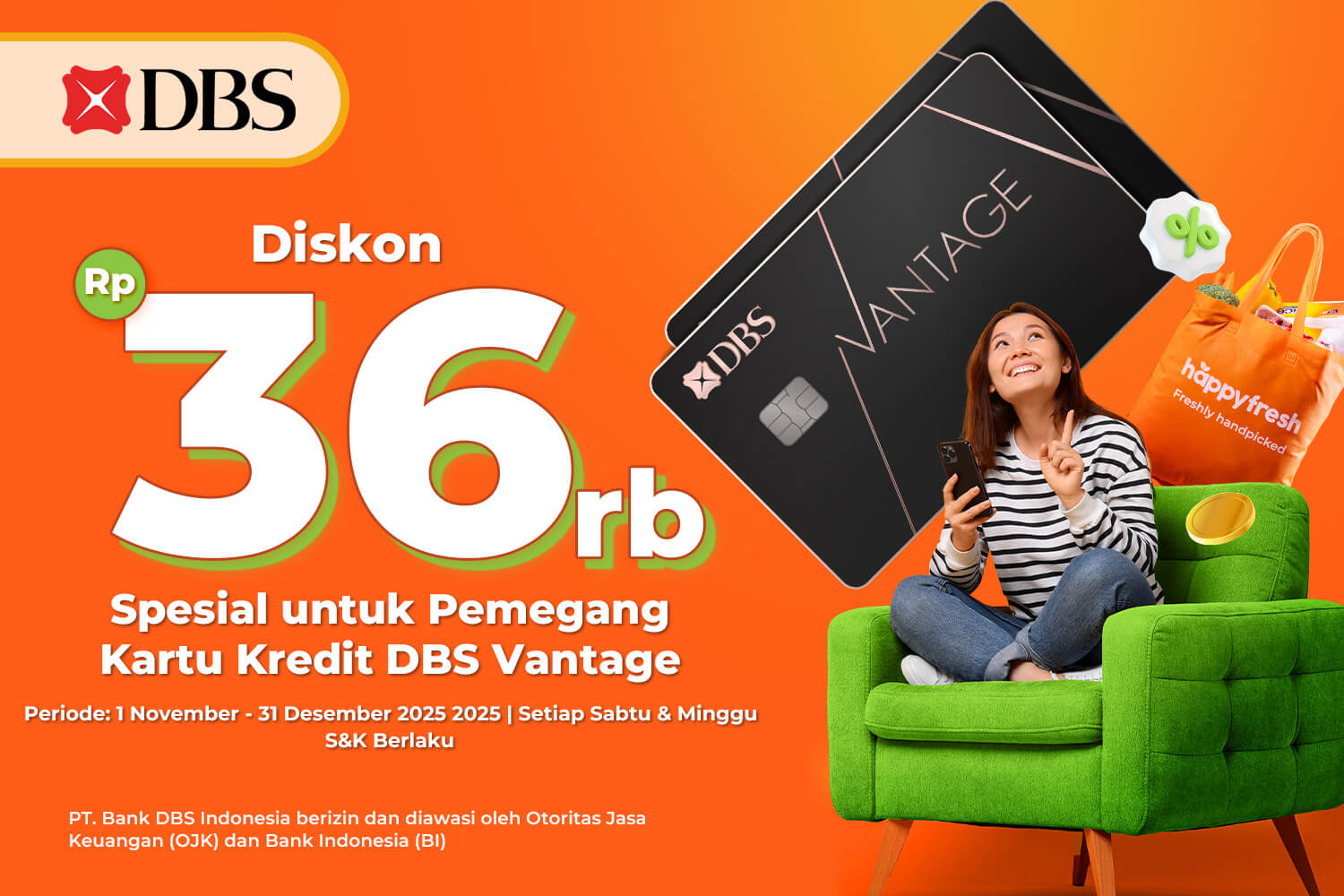 6. Berlaku di aplikasi HappyFresh minimum versi 3.87 dengan memilih metode pembayaran Kartu Kredit DBS Vantage atau Slide Banner promo Kartu Kredit