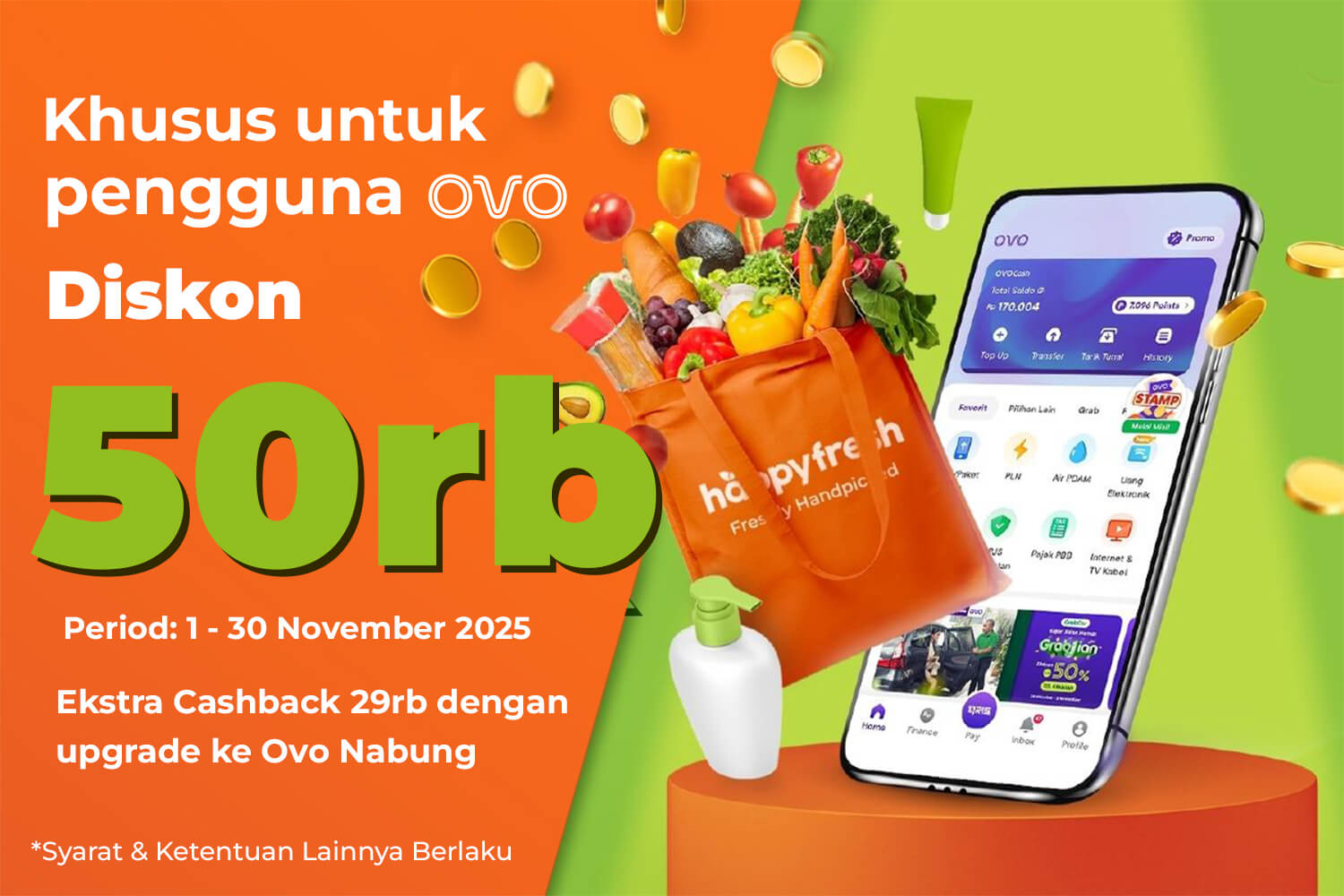 3. Promo valid only at HappyFresh applications minimum version 3.87 with choose E-wallet payment method for OVO promo (Slide Banner OVO promo), without using this minimum version and choose payment E-wallet method OVOpromo, customer will not get the discount