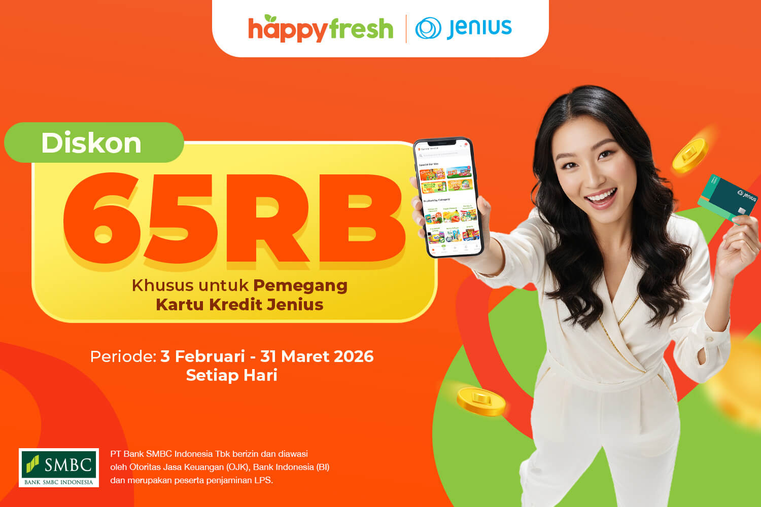 - Berlaku di aplikasi HappyFresh minimum versi 3.87 dengan memilih metode pembayaran Kartu Kredit untuk promo Jenius. Tanpa menggunakan metode pembayaran Kartu Kredit untuk promo Jenius (Slide Banner Jenius), pemegang kartu tidak akan mendapatkan diskon